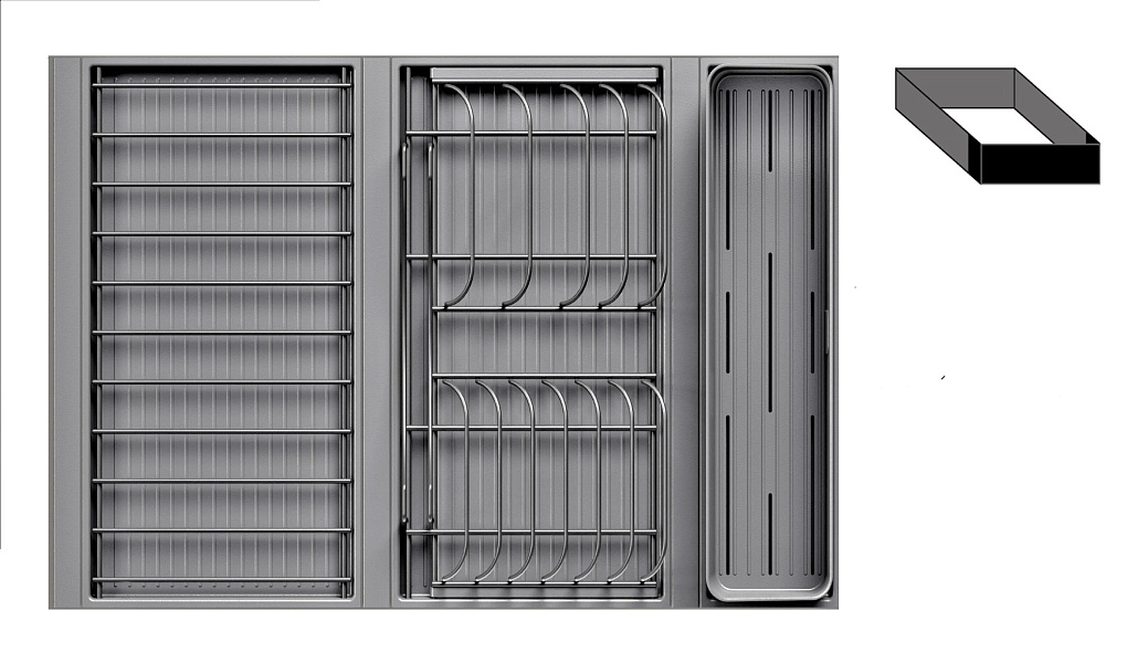 • 1 большой модуль для посуды + 1 малый модуль с решеткой + модуль для столовых приборов