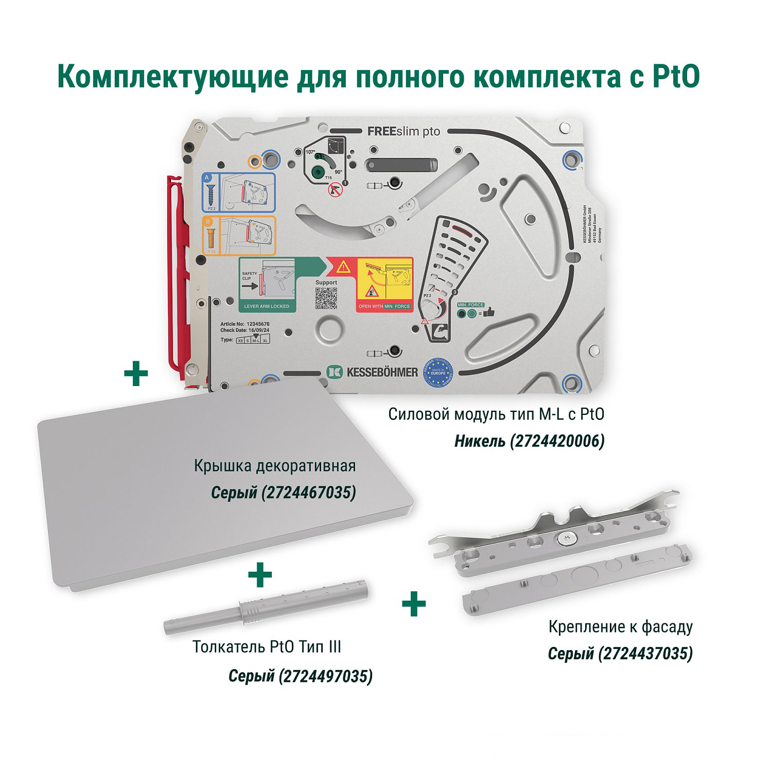 Полный комплект ультратонкого подъемного механизма ФриСлим ФЛАП Kesseböhmer c толкателем PTO тип III для накладного монтажа, цвет СЕРЫЙ